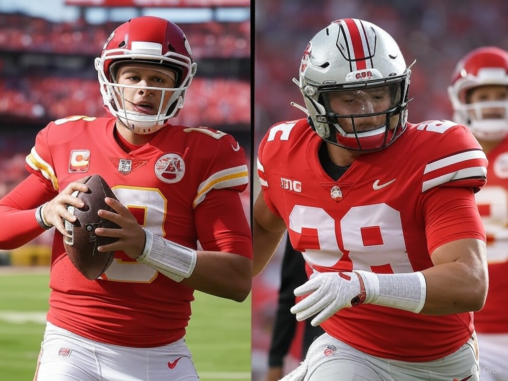 Patrick Mahomes in action meets Josh Simmons in his Ohio State uniform—a glimpse of the Chiefs’ draft strategy blending the present with the future